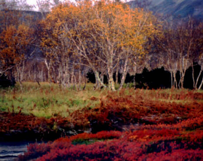 Låglandet i södra och mellersta Kamchatka är - åtminstone i de delar vi har sett under vår resa - täckt av en urskog av kamchatkabjörk (Betula ermanii). Vissa inslag av al, pil och rönn finns i dessa skogar. Jorden, som jag undersökte på ett ställe, var en djup mulljord uppblandad med en mindre andel lavasand. Örtvegetationen i dessa björkskogar är överväldigande. Dels finns den för Kamchatka berömda jätteörtsvegetationen med växter som når 2 m eller mer, dels finns en undervegetation av främst lijeväxter och orkidéer. Utöver de växter som visas eller nämns nedan finns en hel del växter som vi är vana att se även i våra skogar som t ex ekorrbär (Maianthemum bifolium), örnbräken (Pteridium aquilinum) och skogsstjärna (Trientalis europea). Dessutom finns i dessa skogar bl a även Trillium camchaticum, Cypripedium yatabeanum, Cypripedium macranthos, Fritillaria camschatcensis och Aconitum fischeri. Den björkskog jag hade möjlighet att studera närmare, låg i Paratunka, några mil söder om Petropavlosk. Det genomgångna området var inte större än ca 3000 kvadratmeter.