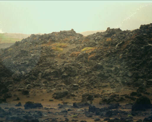 Medan Lech, vår chaufför, undersökte alternativa vägar, utnyttjade jag pausen för att snabbt titta mig omkring i den uppenbarligen rika floran. Eftersom snön här i år inte hade smält förrän i augusti, fanns ganska mycket i blom. Jag sprang efter kameran, när det plötsligen började storma och regna. En cyklon från Japan hade kommit ifatt oss. Tre foton hann jag med, sedan flydde jag genomblöt och totalt utkyld till bilen, som hade hunnit vända. Det som skulle ha blivit en av resans höjdpunkter, slutade i en picknick (i bilen) i den ödsliga calderan som i det piskande regnet hade blivit ännu mera skrämmande. Vilken antiklimax!